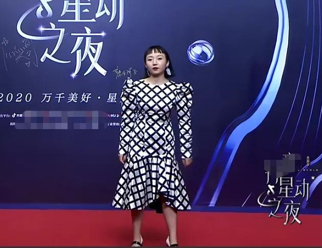 辣目洋子的黑白格蓬蓬袖长裙加上颇具特点的刘海,十分有设计感,只是这视效果看上去像是有了小肚子。