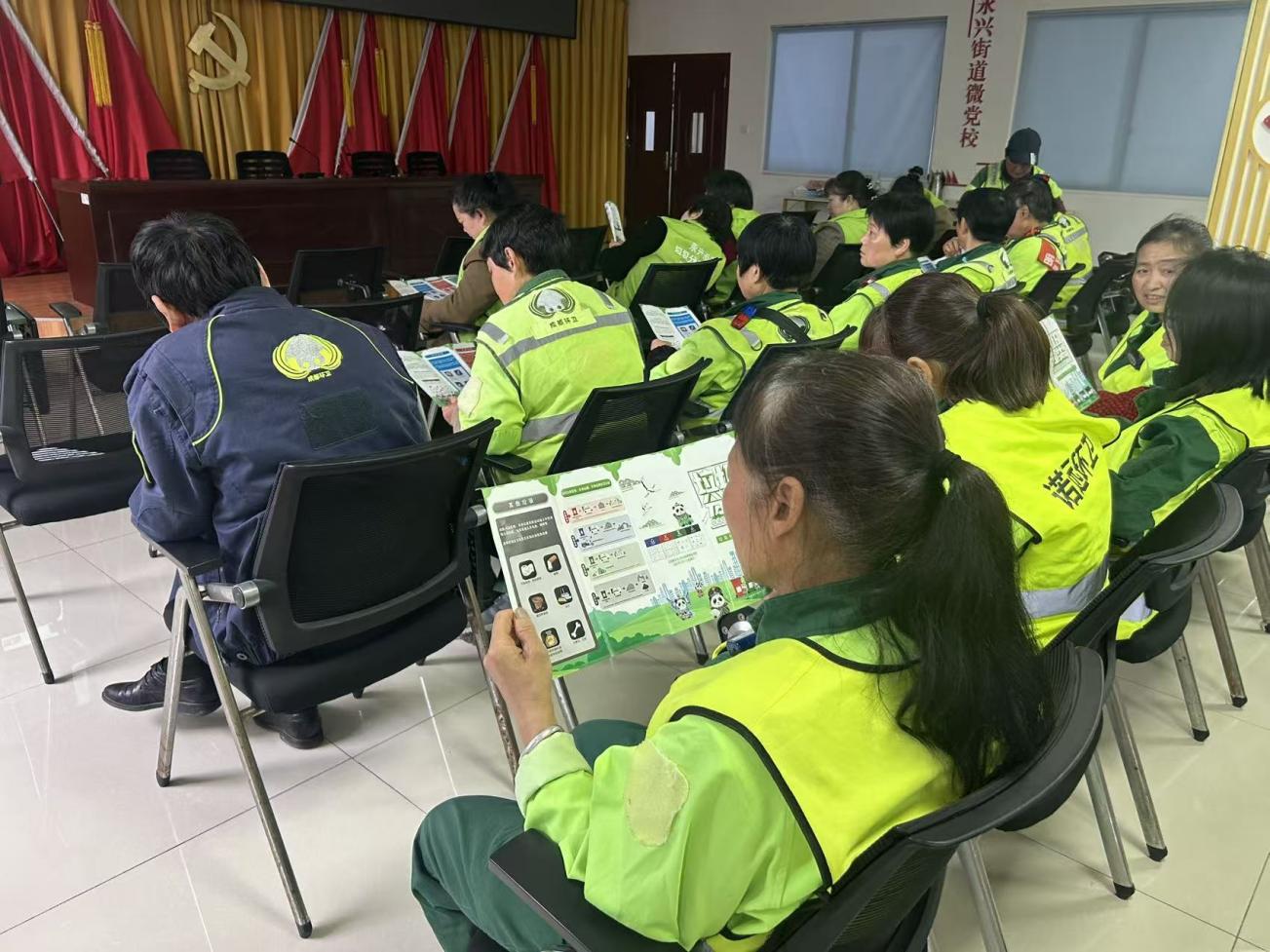 活动现场,大家有序签到领取宣传资料,在轻松的氛围中开启学习。本次培训采用“理论+实操”相结合的形式,内容精准、实用性强。在理论讲解环节,讲解员通过PPT清晰解读垃圾分类政策法规、四类垃圾划分标准及垃圾处理全流程,让大家充分理解垃圾分类的重要意义,夯实理论基础。同时讲解员围绕废纸、塑料、玻璃、金属、织物五大类可回收物,细致讲解“一看材质、二辨标识、三查污染”三步辨别法;针对低价值可回收物、快递包装、破损织物等易混淆难题,逐一厘清分类边界、现场答疑解惑,切实解决实际工作中的分类痛点。